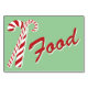 Décorez vos fêtes de Noël ou de Fêtes avec ces cartes de table "Food" de style rétro avec une écriture rouge avec des détails blancs sur un arrière - plan vert menthe avec des sucres de canne rayés rouges et blancs.