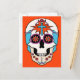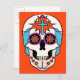 The graphic artwork embellishing this postcard is an illustrated sugar skull, or calavera, decorated with beads and flowers as well as a Christian cross on each forehead. This motif is commonly used during Day of the Dead celebrations or Dia de los Muertos, a Latin American holiday.