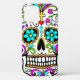 This image features a colourful, stylized skull, commonly known as a sugar skull or calavera de azúcar. It's a traditional symbol associated with the Mexican holiday, Día de los Muertos (Day of the Dead). The skull is adorned with intricate floral patterns in vibrant hues of pink, purple, orange, blue, and green. There's a small, red cross placed on the forehead, and the eyes are replaced with circular, flower-like designs. The skull's overall appearance is festive and cheerful, despite its macabre subject matter.