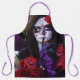A fairy in a sugar skull day of the dead make-up wearing all purple surrounded by red roses and a skull