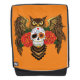 A brown great horned owl with a day od the dead sugar skull and red roses in a backdrop of orange.