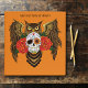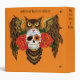 A brown great horned owl with a day of the dead sugar skull and red roses in a backdrop of orange.