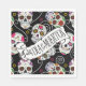 A colourful paper napkin design for Day of the Dead festivities, featuring a variety of decorative sugar skulls with flower and swirl accents on an optional black background. If preferred, the provided 'Feliz Dia de los Muertos' banner and text layer can be deleted to use this design for other occasions.  Search ID725 to see other colour choices and products with this fun pattern.