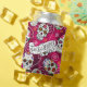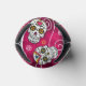 A colourful can cooler design for Day of the Dead festivities, featuring a variety of decorative sugar skulls with flower and swirl accents on a textured-effect rose red background. If preferred, the provided 'Feliz Dia de los Muertos' banner and text layer can be deleted to use this design for other occasions. Search ID725 to see other colour choices and products with this fun pattern.