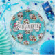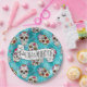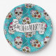 A colourful paper plate design for Day of the Dead festivities, featuring a variety of decorative sugar skulls with flower and swirl accents on a textured-effect turquoise blue background. If preferred, the provided 'Feliz Dia de los Muertos' banner and text layer can be deleted to use this design for other occasions. Search ID725 to see other colour choices and products with this fun pattern.