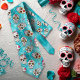 A colourful necktie design for 'Day of the Dead' or Halloween festivities, featuring a variety of decorative sugar skulls with flower and swirl accents on a textured-effect turquoise blue background. Search ID725 to see other colour choices and products with this fun pattern.
