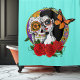 A sugar skull sits in behind a woman wearing a day of the dead sugar skull make-up all drawn in an art nouveaux style.
