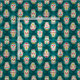 This patterned fabric has a Dia De Los Muertos or Mexican Day of the Dead style with illustrations of sugar skulls in cream with brightly coloured accents in pink, orange, yellow, turquoise blue and light green. The skull graphics are set against a teal chequered background with lace graphic accents.