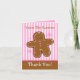 Customizable Christmas note or greeting cards with an adorable little gingerbread man with pink candy nose and buttons and white frosting. Pink and white striped background and gingerbread border. Perfect for thank you notes! Coordinated gift tags, postage stamps, stationery and magnets also available! PinkInkArt original!