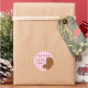 Customizable Christmas sticker with an adorable little gingerbread man with pink candy nose and buttons and white frosting. Pink and white striped background. Great as gift tags! Coordinated gift tags, note cards, postage stamps, stationery and mugs also available! PinkInkArt original!