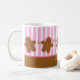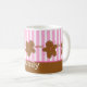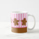 Customizable Christmas mug with an adorable row of little gingerbread men with pink candy noses and buttons and white frosting. Pink and white striped background and gingerbread border. Coordinated gift tags, note cards, postage stamps, stationery and magnets also available! PinkInkArt original!