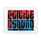 Red and Blue Suicide Squad logo with characters seen inside each letter.