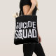 Black and White Suicide Squad logo with a Skull in the letter Q. White letters on black background.