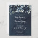 Peonies en cascade bleu marine avec feuillage d'eucalyptus argenté vert contre un arrière - plan d'aquarelle bleu profond avec une calligraphie d'encombrement de police blanc fantaisie annonçant votre mariage.