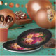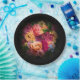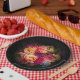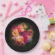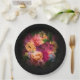Lush floral arrangements in bright, warm colours ranging from coral and rose pink to golden yellow combine with vignetted, obsidian backgrounds to give the pieces in this elegant wedding suite a dark, moody ambience. This eye-catching paper plate features a background pattern of colourful blooms with a border vignette to a a touch of romance. Search ID829 to see the complete collection.