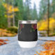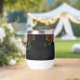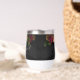 Lush floral arrangements in bright, warm colours ranging from coral and rose pink to golden yellow combine with vignetted, obsidian backgrounds to give the pieces in this elegant wedding suite a dark, moody ambience. This wedding thermal wine tumbler features abundant flowers, elegant calligraphy 'Cheers', your names and wedding date. Search ID829 to see the complete collection.