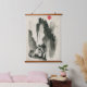 Sumi-e ink painting with mountains, a monastery and a monk. A red sun high above that somehow seems apocalyptic.