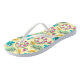Yellow flip flops with a pattern of life preservers, palm fronds, watermelon slices and popsicles are perfect to dress up your outfit for any occasion.