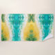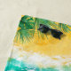 A vibrant beach towel featuring a tropical design with turquoise waves and golden sand.
