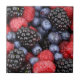 Photograph of colourful summer raspberries, blackberries, and blueberries printed to edges of tile.