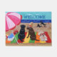 Funny Labrador Retriever on the beach Painting design. Welcome message is printed and you can change it. Black Labrador and Chocolate Labrador and Yellow Labrador are all painted in the picture. Happy and cute Labrador Retriever dogs are having lots of fun on the beach. Colourful and cheery summer scenery with Labs. Painted by Naomi Ochiai from Japan.