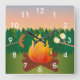 A fun design featuring a hot dog and marshmallows toasting over a fire. The background is a tree-lined forest and a sky at dusk or sunset. This clock is great for a room with an outdoor, nature, or camping theme.
