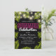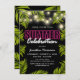 Summer birthday party invitations featuring a stylish black background that can be changed to any colour, twinkle string lights, tropical summer palm leaves, a pink & white neon sign, and a modern party template that can easily be personalized.