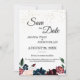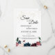 This “Summer Celebration” wedding save the date inspires a traditional and elegant floral atmosphere for a garden wedding. With pink, royal blue, and cabernet burgundy flowers, the rich reds and navy palate combined with gold glitter compliment formal spring, summer and autumn themes, creating a classic and versatile luxury marriage celebration experience.