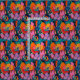 A bright coloured abstract summer floral pattern in shades of gold, orange, pink, blue and green.
