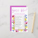 Guess Who is written in a pink trendy bouncing font. Mommy or Daddy is also in pink but using an open serif font. A pink frame surrounds the questions. Summer flowers decorate the frame. They are a colourful pink, blue, purple and yellow daisies, protea and echinacea. This baby shower game is designed to coordinate with the Baby in Bloom collection. Message me if you need help finding a coordinating items. I'm Nelda and I'd love to help!