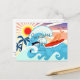 Summer fun, Down Under. Whimsical design in bright colours, all things Australian for beach fun: Surfing, sunshine, palm trees, kangaroos, sandy beach, and a great big smile!