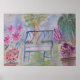 What can be better on a hot summer afternoon than wandering into the garden and relaxing on the bench. In this charming watercolor, the blue bench sits on the lawn surrounded by pretty flowers, lavender and trees. Feel the sun on your face when you choose this soft pastel summer garden bench art.