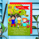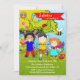 A cute children's birthday party invitation featuring a cartoon drawing of children playing outside, surrounded by bees, butterflies and flowers.