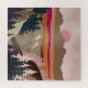 An abstract landscape with unique colours and textures showing a nature landscape with a rising sun and two geese in shades of orange, beige, brown and pink.