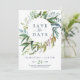 This summer greenery save the date card is perfect for an elegant midsummer wedding. The botanical design features a lush arrangement of painted watercolor eucalyptus, greenery, and green leaves with subtle sprigs of blush pink blossoms.