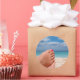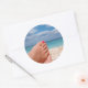Round photo sticker with women's feet with pink red nail polish on a white beach on an island in the mediterranean sea relaxing during the summer holidays.