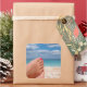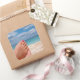 Square sticker of women's feet with pink red nail polish on a white beach on an island in the mediterranean sea relaxing during the summer holidays.