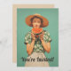 A cheerful woman in a sunhat and floral shirt enjoys a slice of watermelon against a vibrant teal background, capturing a perfect moment of summertime happiness.