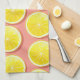 A pattern of fresh & juicy lemon slices in bright, vivid shades of yellow, with a watercolour texture to give it that freshly cut look. They are placed on a salmon pink background for a bright & summery look, like pink lemonade.