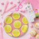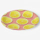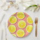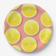 A pattern of fresh & juicy lemon slices in bright, vivid shades of yellow, with a watercolour texture to give it that freshly cut look. They are placed on a salmon pink background for a bright & summery look, like pink lemonade.
