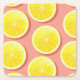 A pattern of fresh & juicy lemon slices in bright, vivid shades of yellow, with a watercolour texture to give it that freshly cut look. They are placed on a salmon pink background for a bright & summery look, like pink lemonade.