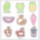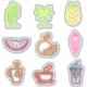 A collection of neon look summer themed stickers. Cactus, iced coffee, watermelon, ice cream, pineapple, orange, tea and coffee, Palm tree