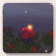 In the dusk of a summer night fireflies float and glow over a rose garden filled with vibrant red roses.
