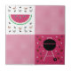 As an homage to the tasty treats of summer, this classic picnic tablecloth pattern is adorned with a slice of watermelon surrounded by ants and seeds in the white squares and a kettle grill framed by steaks, mushrooms, and charcoal pieces in the other. This tile can be framed to create a trivet or placed inside a wooden gift box lid. Tiles without a frame will also fit inside the large gift box to create a matching set.