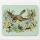 Summer at a pond scene, with birds flying and pretty flowers in bloom.