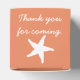 Give your guests, bridesmaids, groomsmen, or anyone else a special treat with these customizable favour boxes featuring a coral background with a white sand dollar, seashell, and starfish on the front, back, and top of the box, respectively. Each of these sides also features some sample text that you can customize for your own summer or beach-themed wedding or event. Be sure to check out the other products in the Summer Seashells in Coral set to create a truly coordinated look for your event.