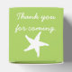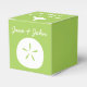 Give your guests, bridesmaids, groomsmen, or anyone else a special treat with these customizable favour boxes featuring a peridot green background with a white sand dollar, seashell, and starfish on the front, back, and top of the box, respectively. Each of these sides also features some sample text that you can customize for your own summer or beach-themed wedding or event. Be sure to check out the other products in the Summer Seashells in Peridot set to create a truly coordinated look for your event.
