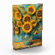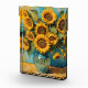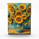 This design shows a vibrant bouquet of sunflowers against a colorful, impressionist background. The sunflowers, with their bright yellow petals and green leaves, emit heat and energy. The blue background is a fine contrast to the warm colors of the flowers, making the whole a harmonious and vibrant composition.