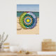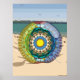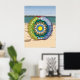 This beach themed mandala features layers of seashells, sailboats, sand, sun, sea, and palm trees inside of a transparent beach ball sitting on a sandy beach with the sea and sky visible on the horizon to bring to mind the fun that comes with summer.