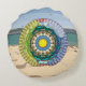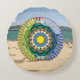 This beach themed mandala features layers of seashells, sailboats, sand, sun, sea, and palm trees inside of a transparent beach ball to bring to mind the fun that comes with summer.